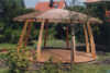 Die Konstruktion ist aus Leimholz- Lärche gefertigt, die Kanthölzer sind mit Schlitzt und Zapfen verbunden.